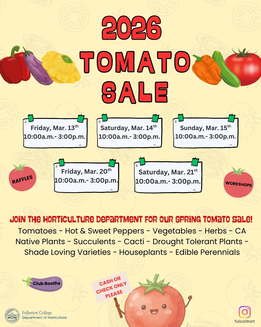 Our department hosts events for such groups as Fullerton Beautiful, Orange County Master Gardeners, and the California Landscape Contractors Association. Finally, our program hosts several plant sales each year to help provide gardeners with unusual garden plants, herbs, and vegetables. In short, we strive to provide a program of instruction as unique and varied as the students who enroll in our courses.