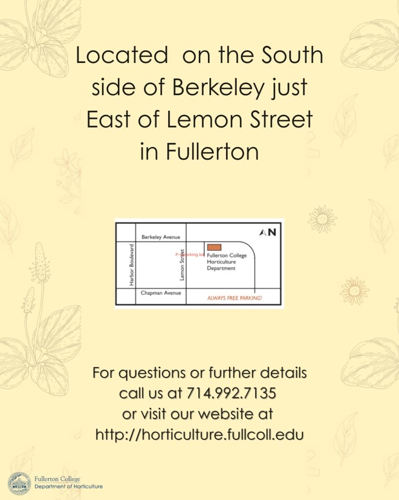 The Horticulture Department at Fullerton College is one of the leading community college horticulture programs in California. We offer a widely varied program which provides ‘hands-on’ classes for homeowners, nursery and landscape employees, and students wishing to enter the ‘green industry’. With a unique blend of the old and the new, our facilities combine high technology with traditional landscaping and growing practices.
